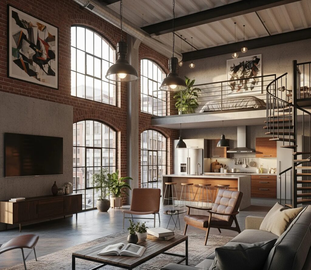 Modern industrial-style urban loft interior with exposed brick walls, large arched windows, open kitchen, mezzanine bedroom, warm wooden textures, metal railing staircase, ambient lighting- photorealistic 8K render.